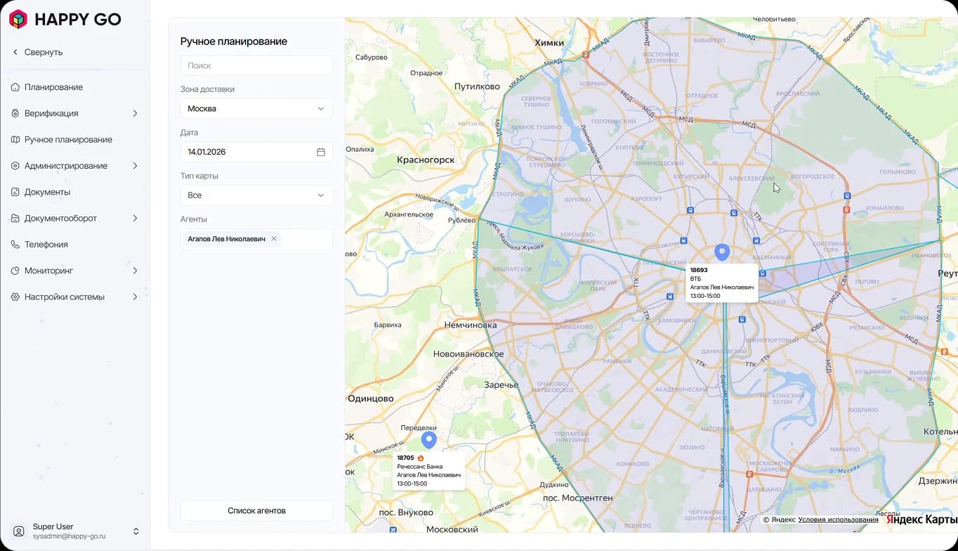 Интеллектуальное распределение заказов и построение оптимальных маршрутов. Собственные алгоритмы учитывают географию, приоритеты, временные окна и загрузку сотрудников